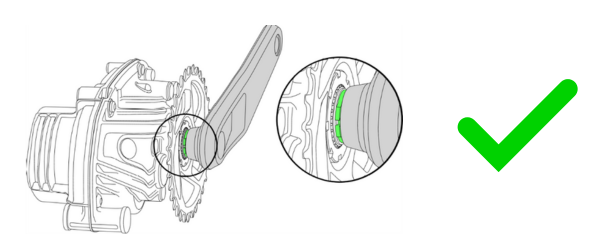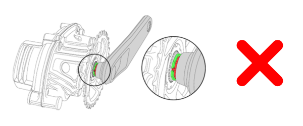 Katso kampien ja keskiön väliin, ja varmista, että kampivarsi on täysin kiinni eturattaan lukitusrengasta vasten (katso kuva). Tarkista myös mahdolliset vauriot kampivarren kiinnityksessä.